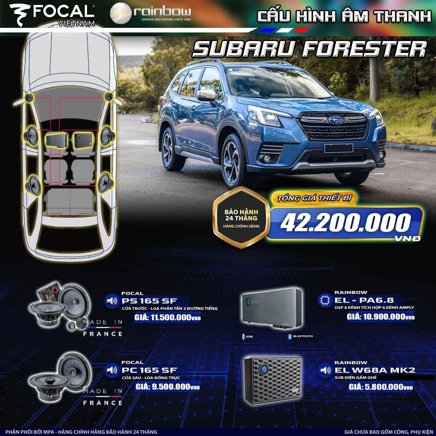 Subaru Forester là một dòng xe rất được ưa chuộng tại thị trường Việt Nam với những tính năng an toàn hỗ trợ cho người lái , khả năng vận hành ổn định và bền bỉ . Hệ thống âm thanh của xe cũng được trang bị gồm 6 loa cơ bản để đáp ứng nhu cầu giải trí cho chủ xe . Nhưng có những khách hàng muốn nhu cầu nghe nhạc chất lượng cao thì hệ thống này không thể đáp ứng được