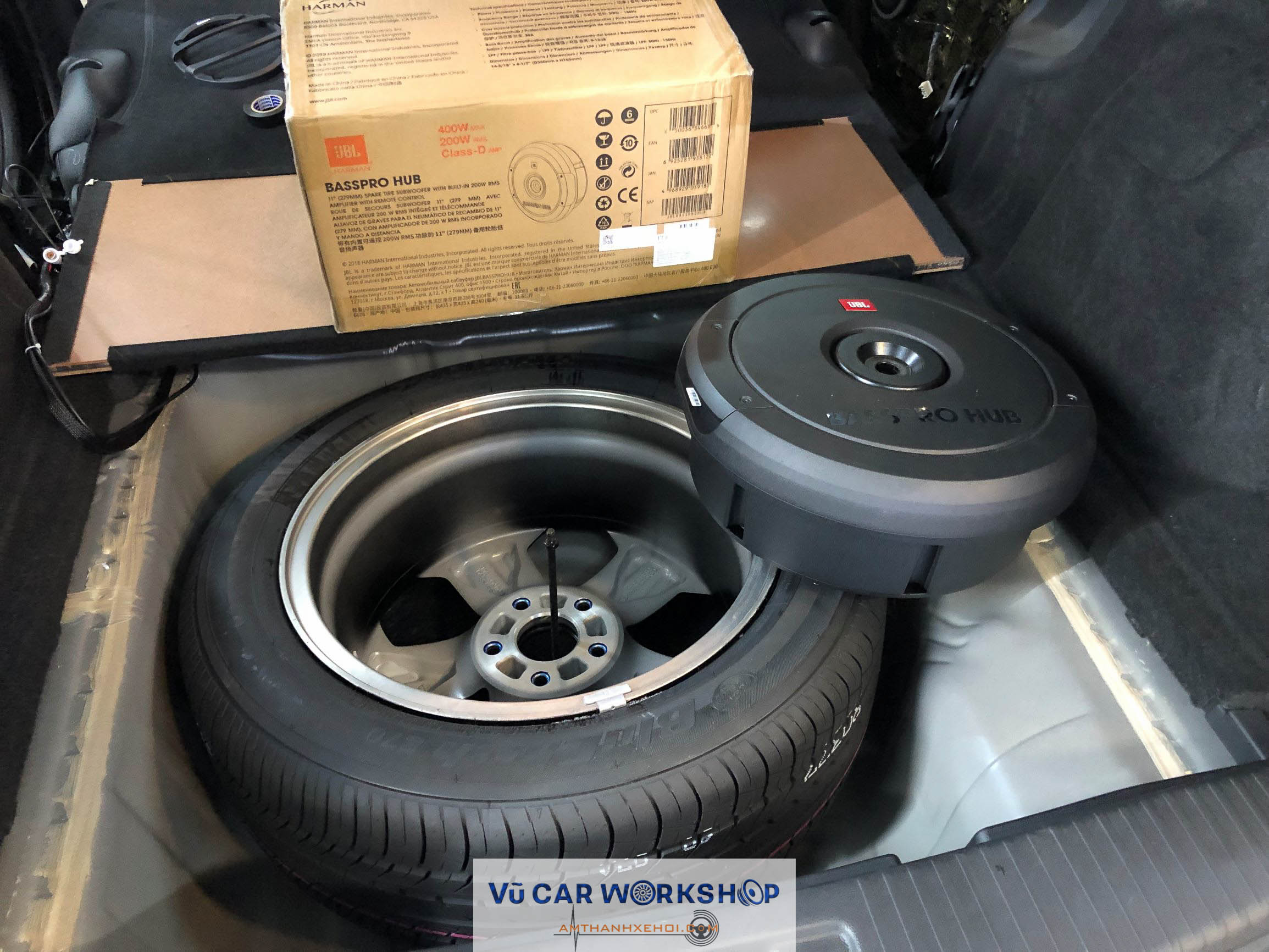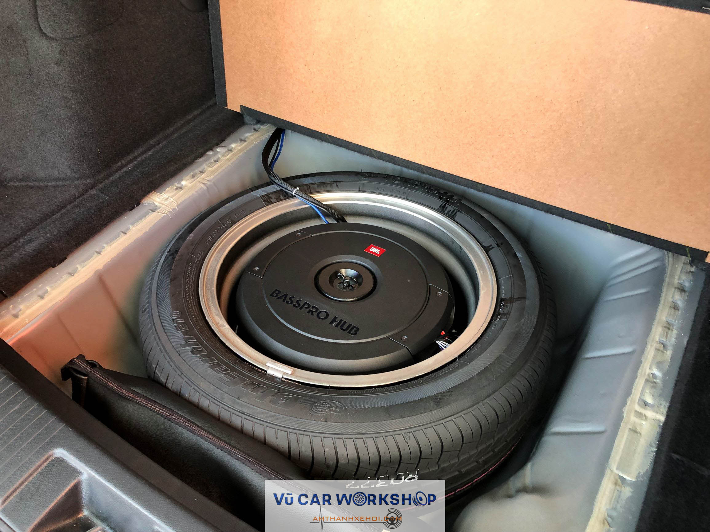 Sub JBL Basspro Hub để gọn trong bánh dự phòng.