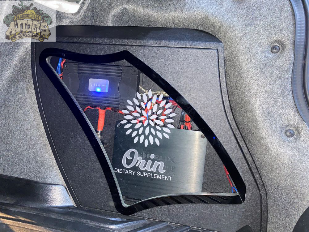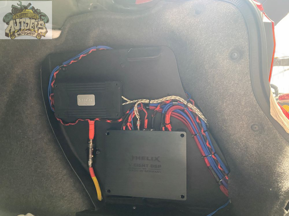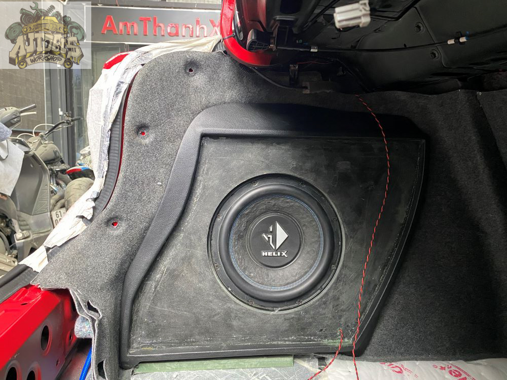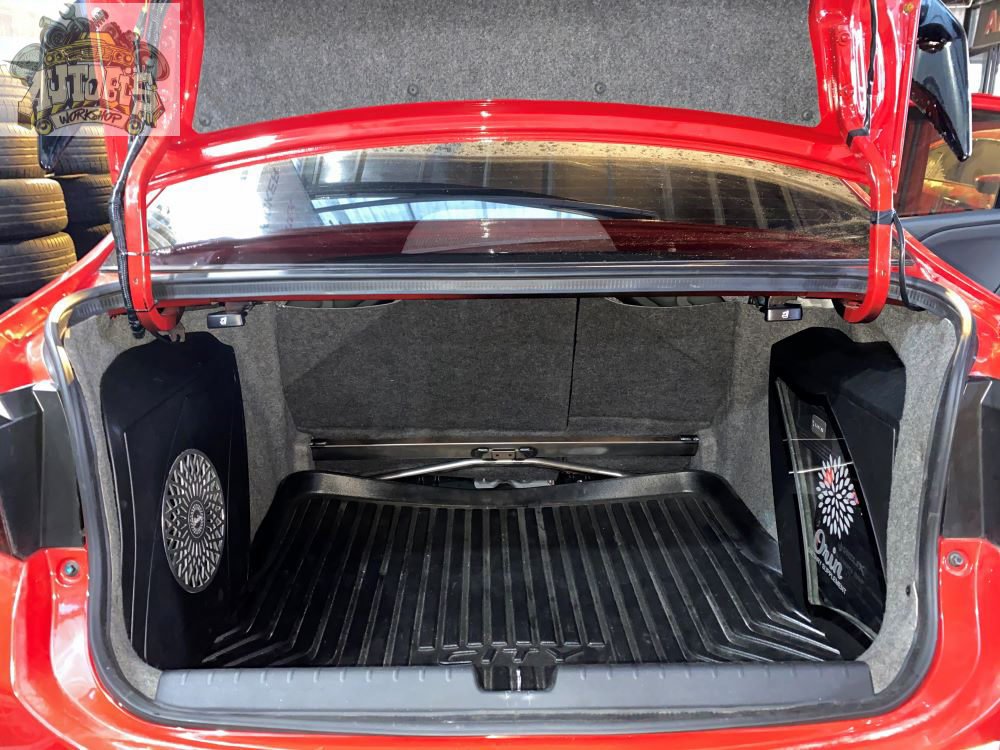 Hệ thống ampli, bộ xử lý tín hiệu và sub 10″ được đội AUTOBIS thi công thiết kế nằm gọn 2 bên hốc phía sau cốp
