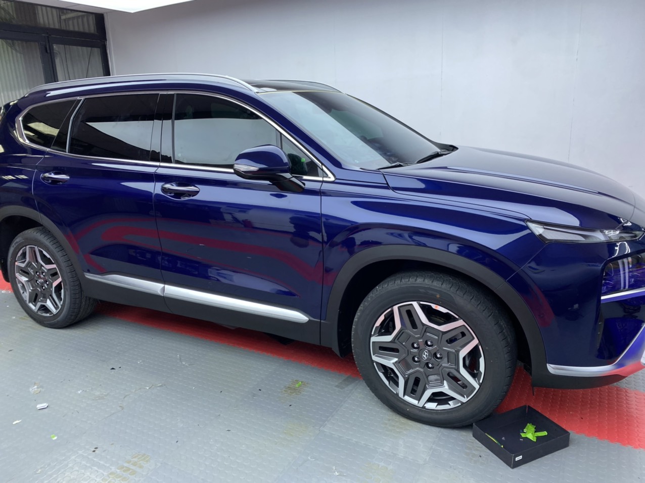 Chiếc Hyundai Santafe 2022, vừa từ hãng về chưa có biển số, để thực hiện thi công cách âm, cũng như thêm nhiều hạng mục bảo vệ cho xe như PPF cũng như phim cách nhiệt.. đặc biệt hơn còn gói bảo vệ kính lái cường lực , chống tác động vật lý bên bề mặt kính lên đến 7kg.