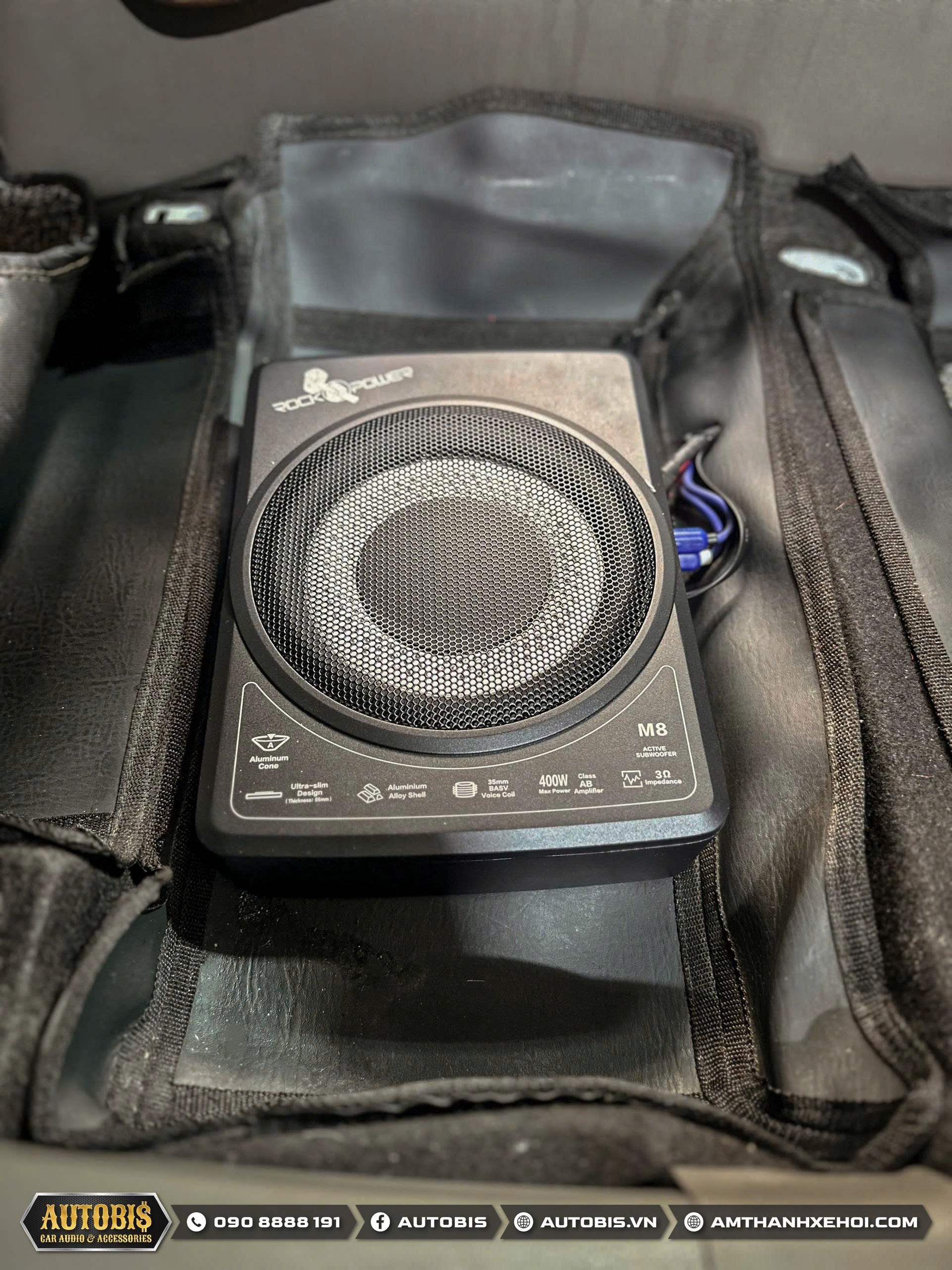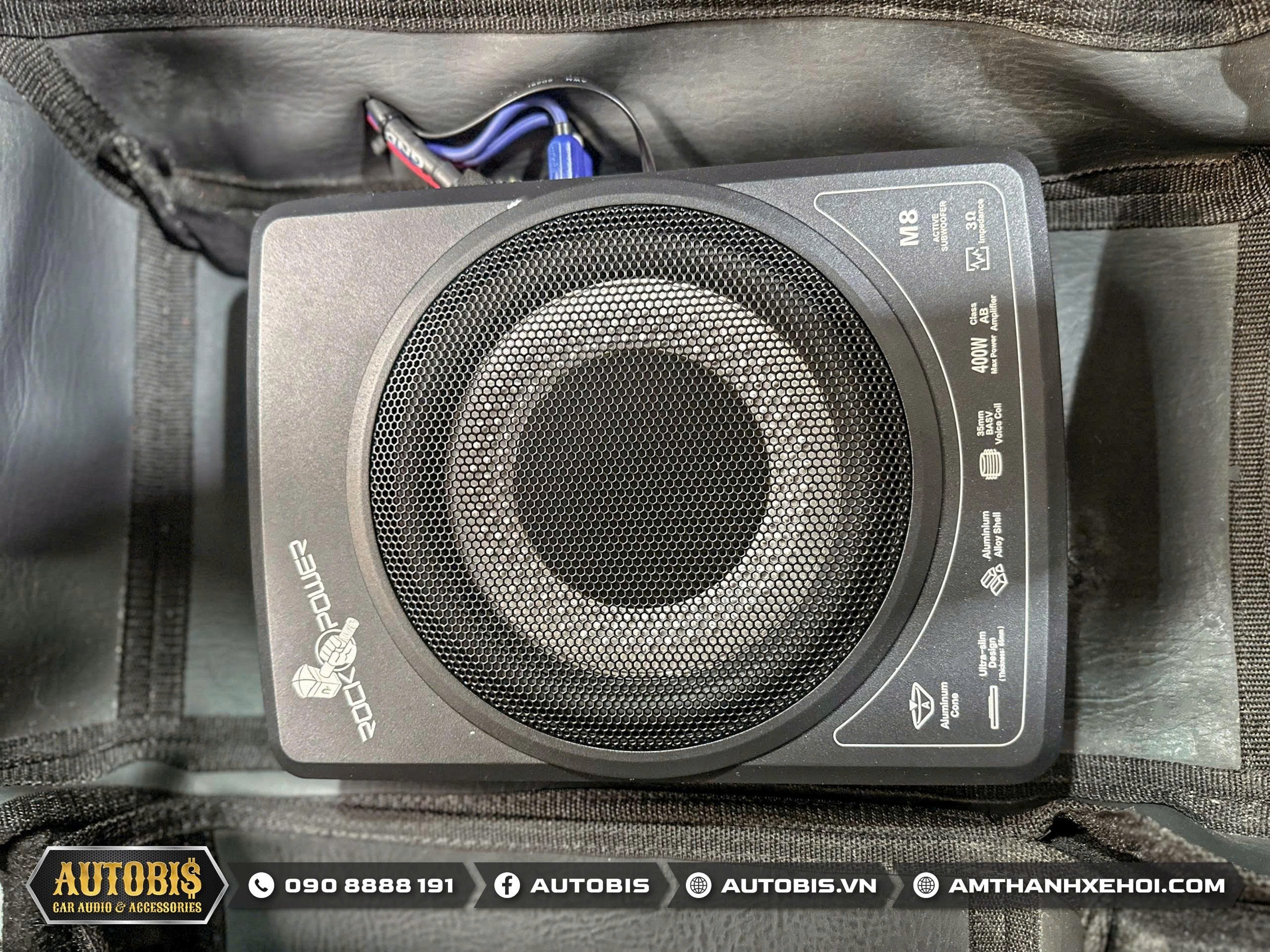Sub điện gầm ghế Rockpower M8 được lắp đặt ở dưới ghế phụ
