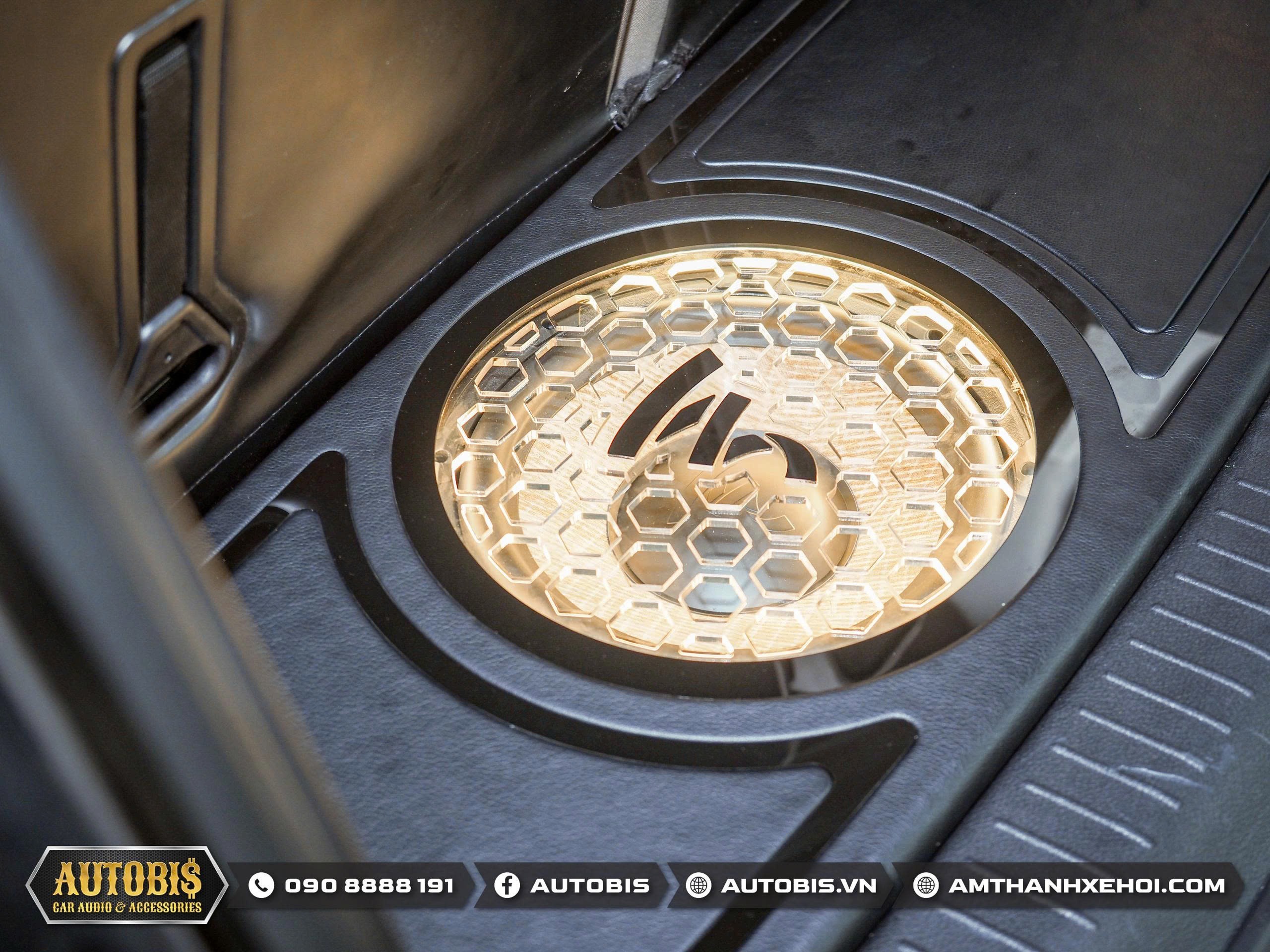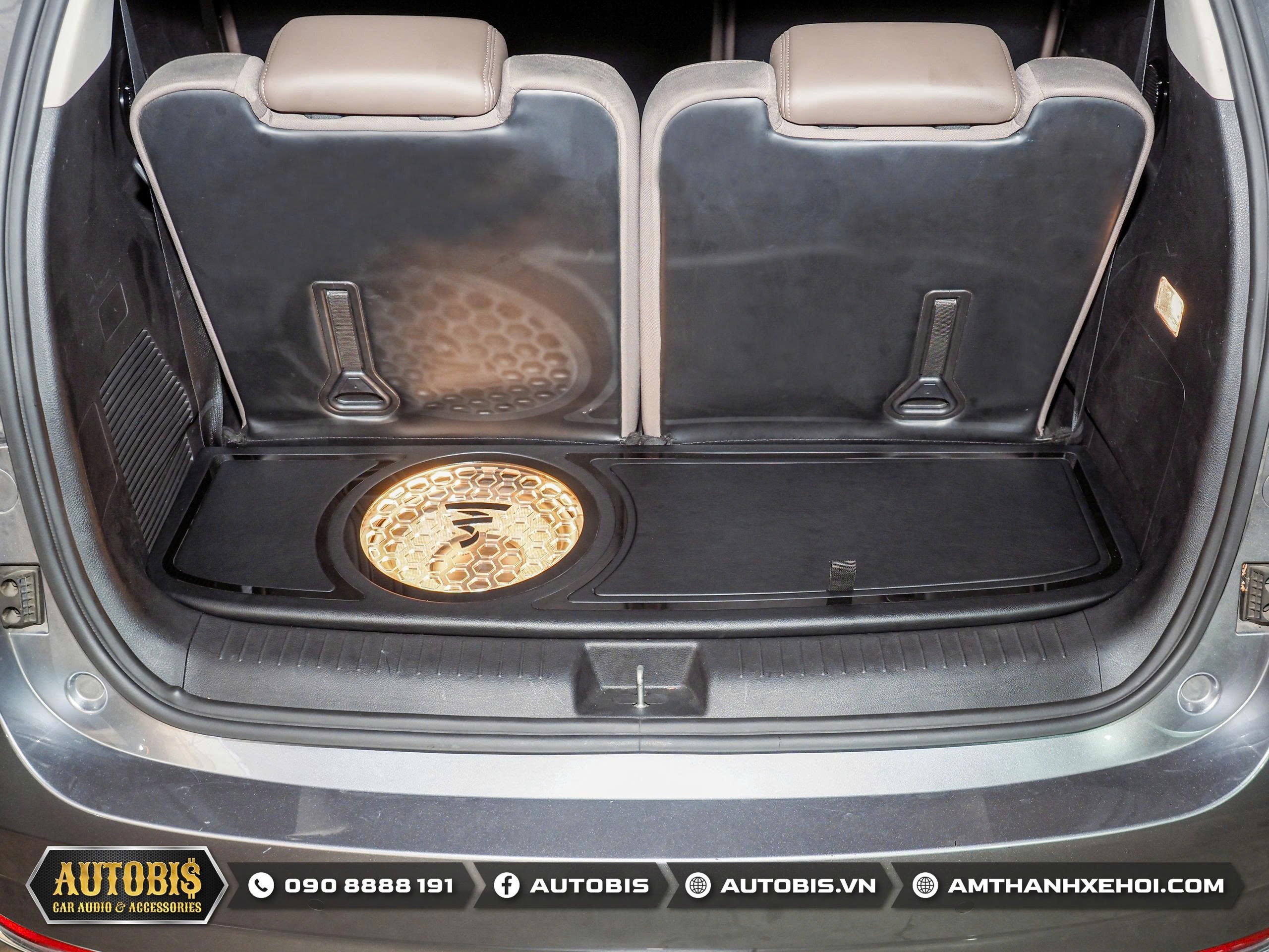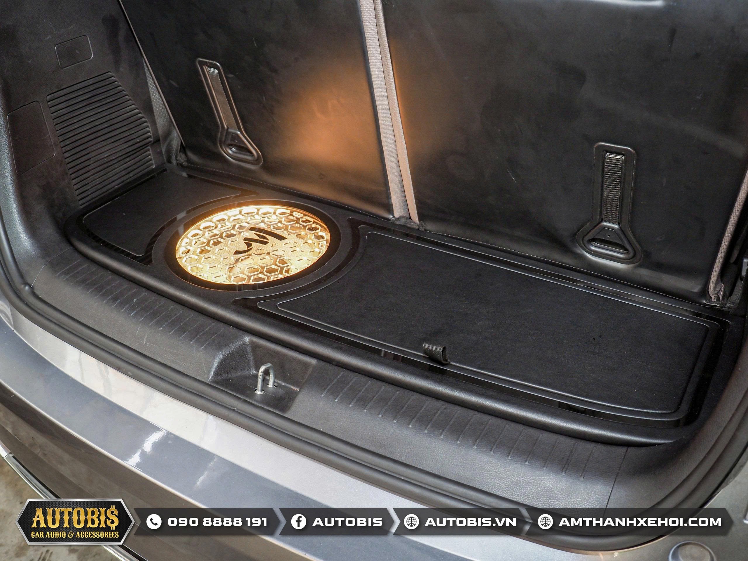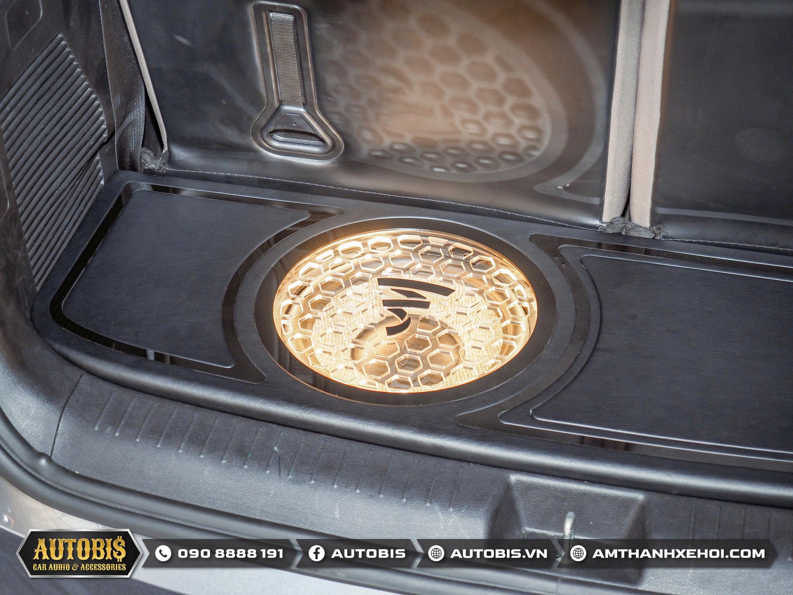 Thùng sub hơi được Autobis thi công đặt tại vị trí sau cốp. Các chi tiết như mặt lưới bảo vệ, trang trí tạo điểm nhấn cho phần nhìn bắt mắt.
