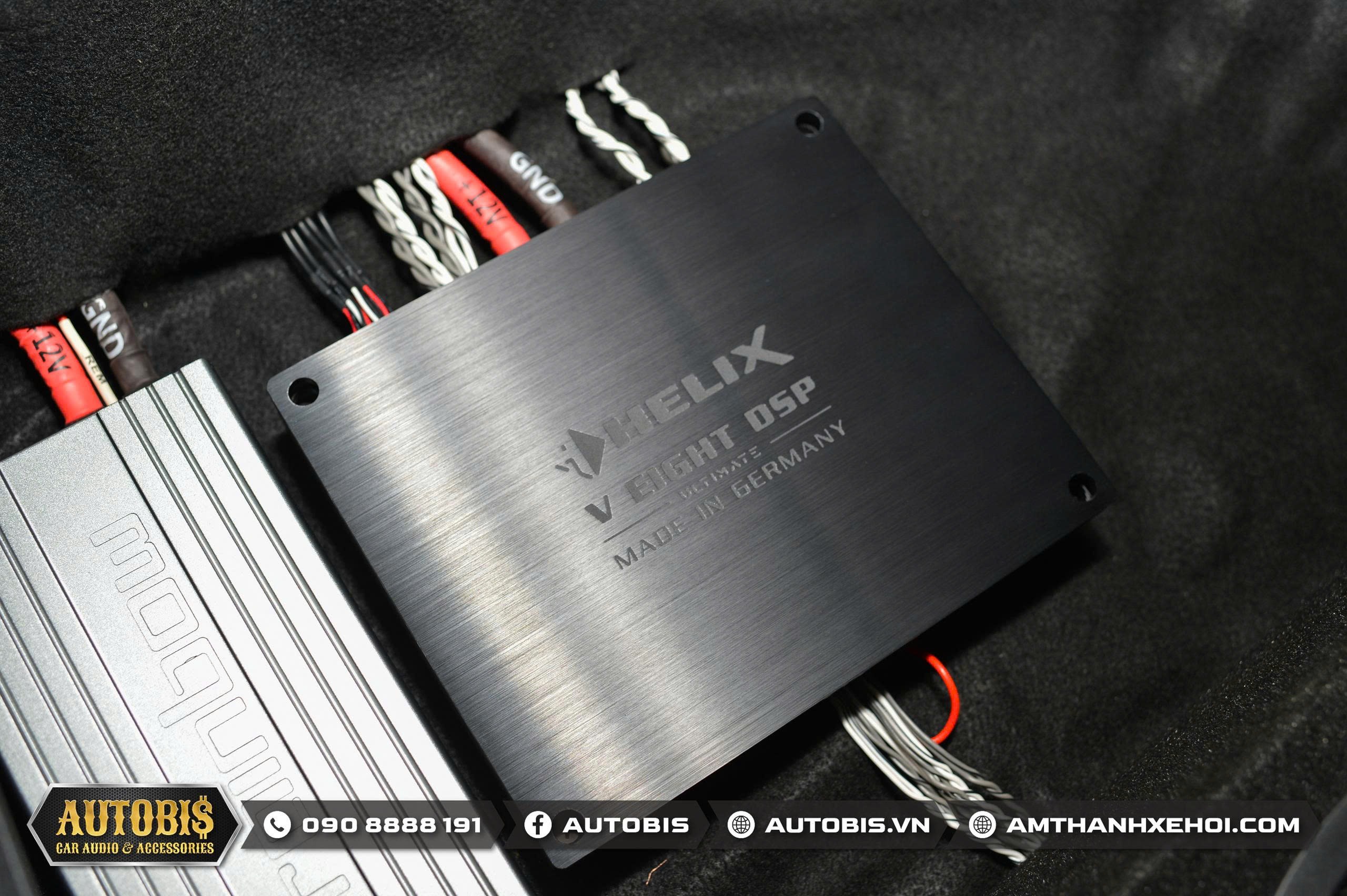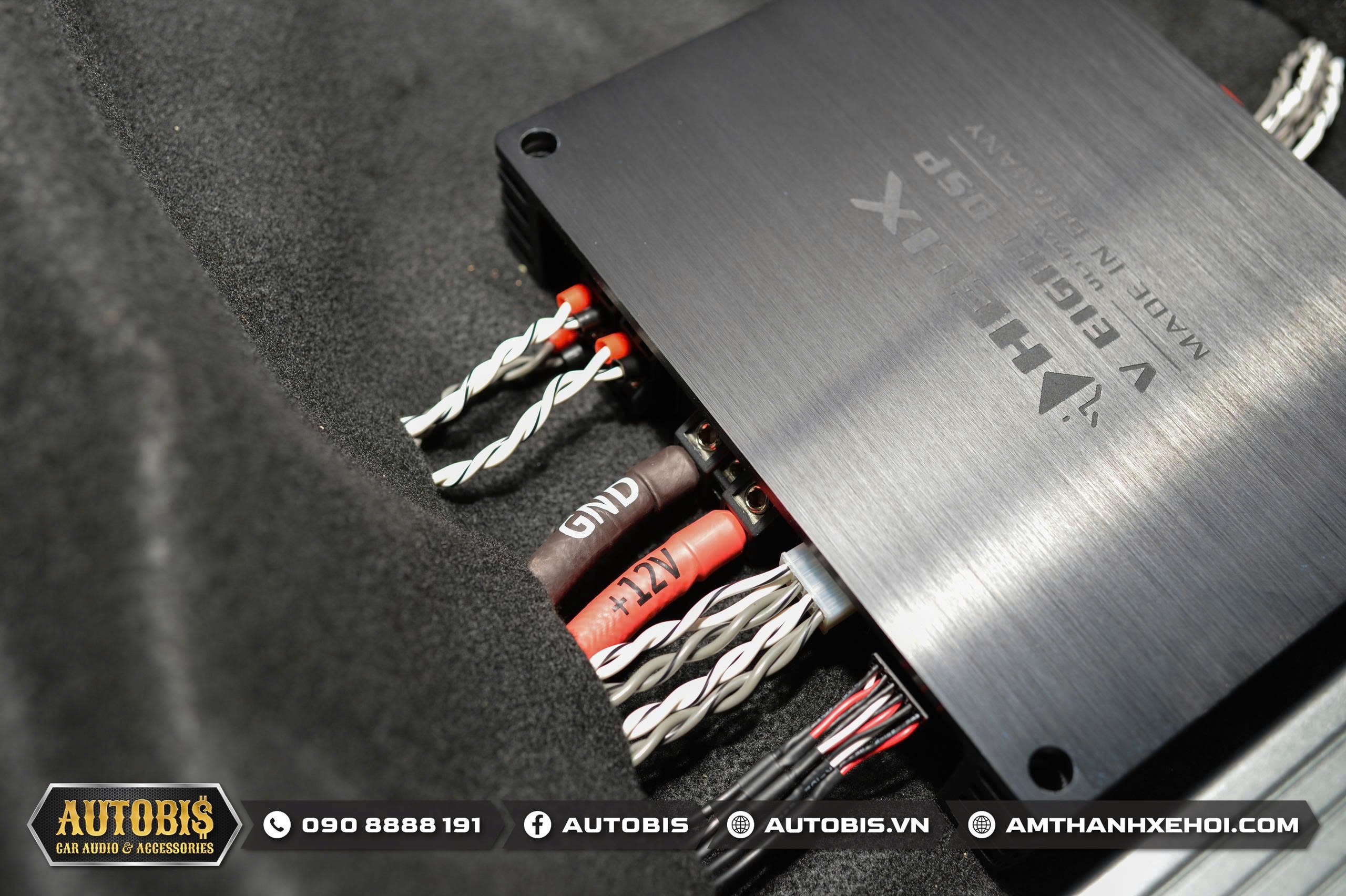 Với cấu hình âm thanh trên DSP tích hợp amply Helix V EIGHT DSP ULTIMATE được thi công tại vị trí hốc bánh sơ cua.