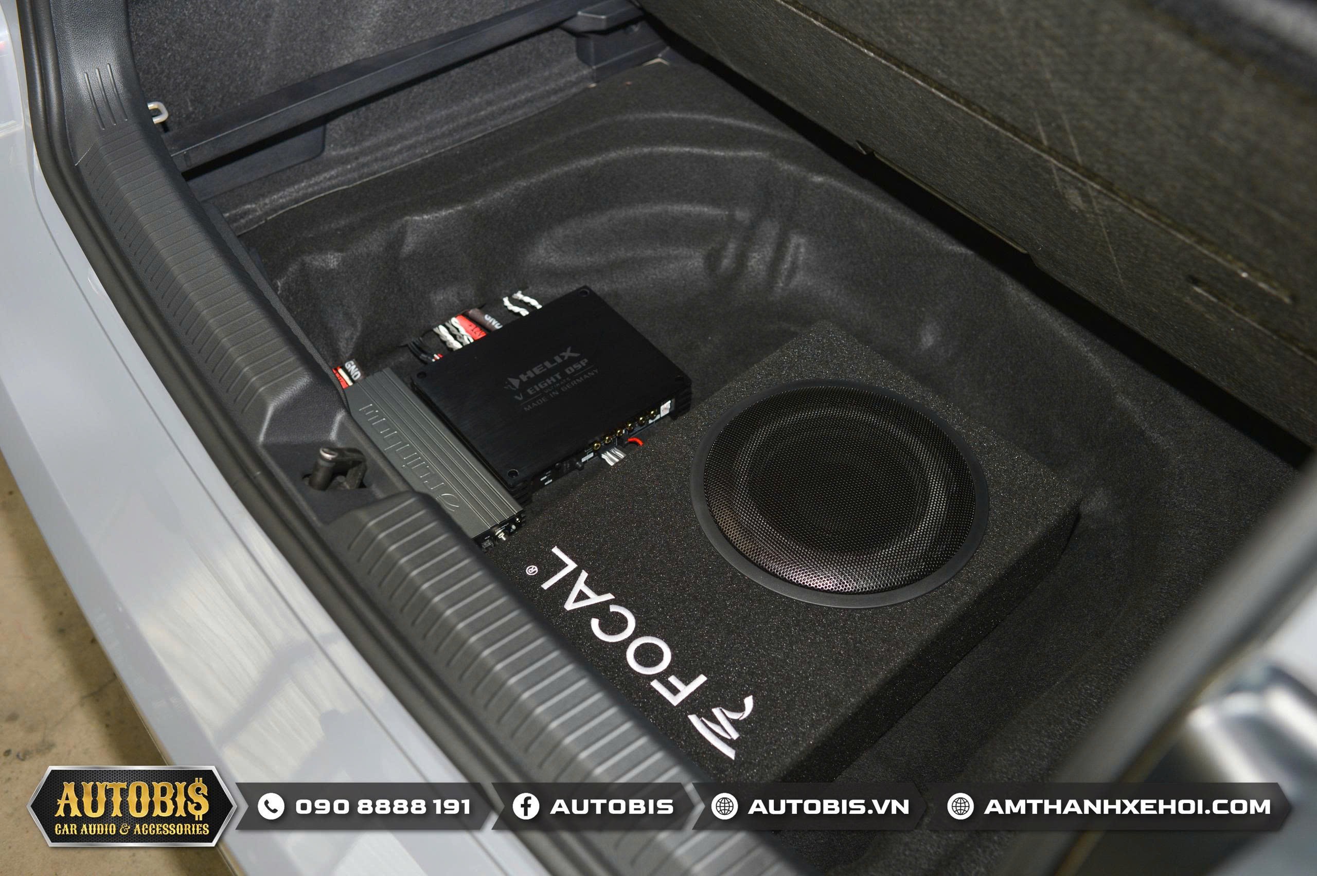 Với cấu hình âm thanh trên DSP tích hợp amply Helix V EIGHT DSP ULTIMATE được thi công tại vị trí hốc bánh sơ cua.