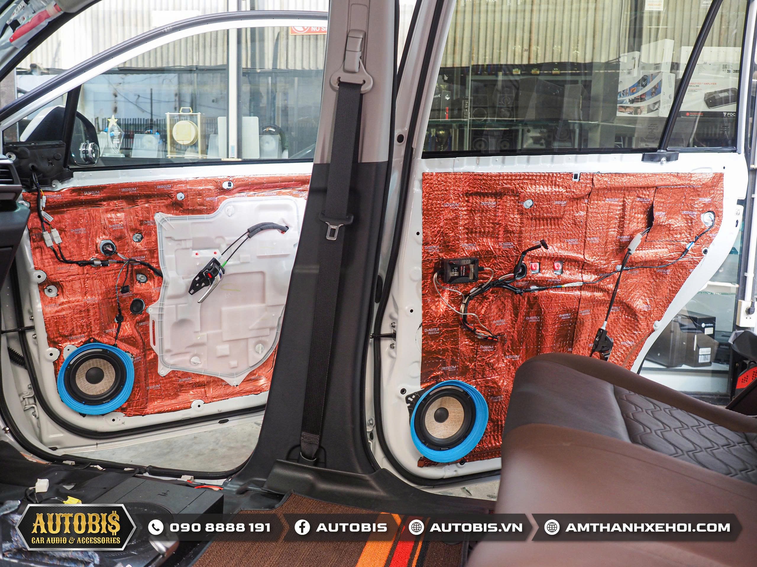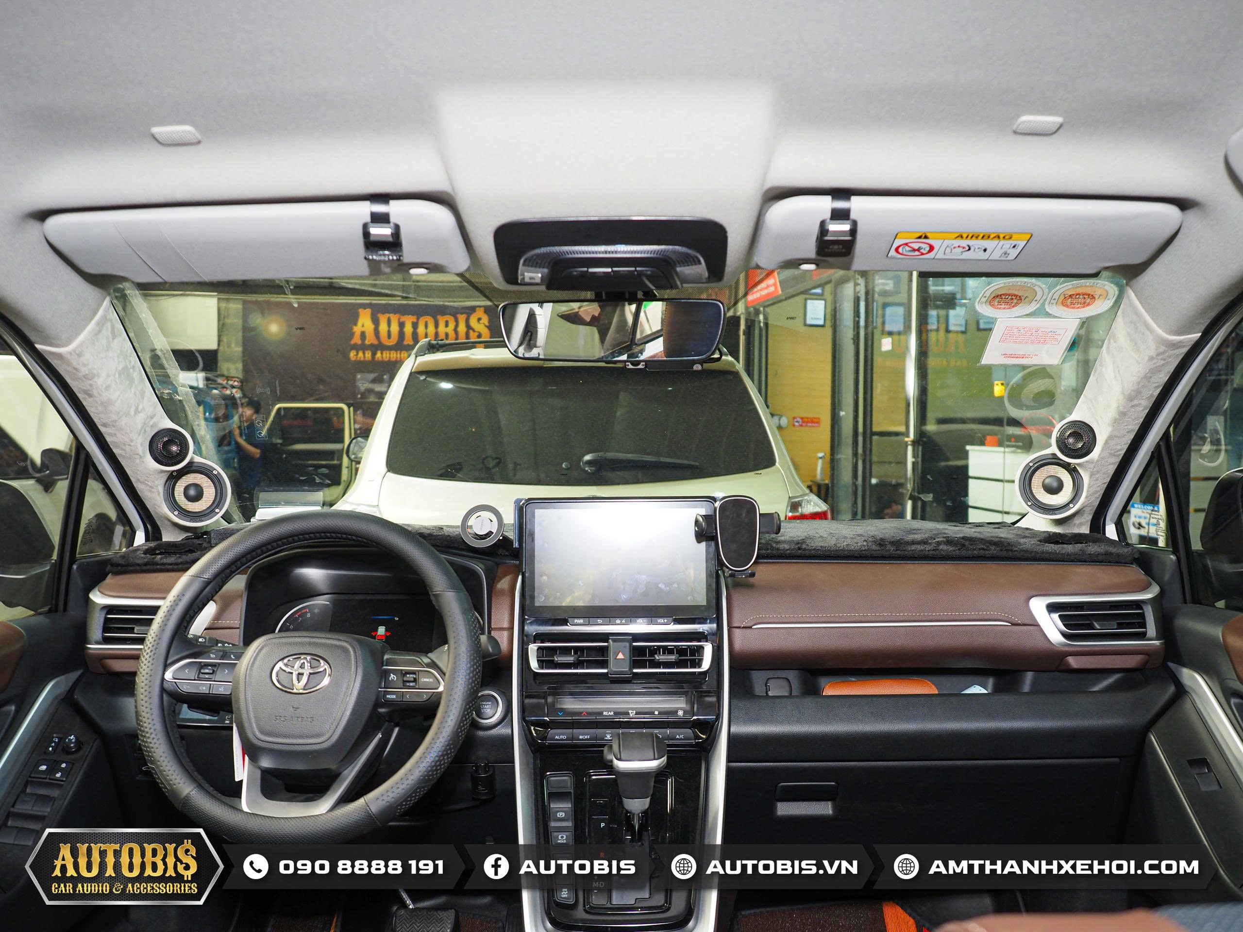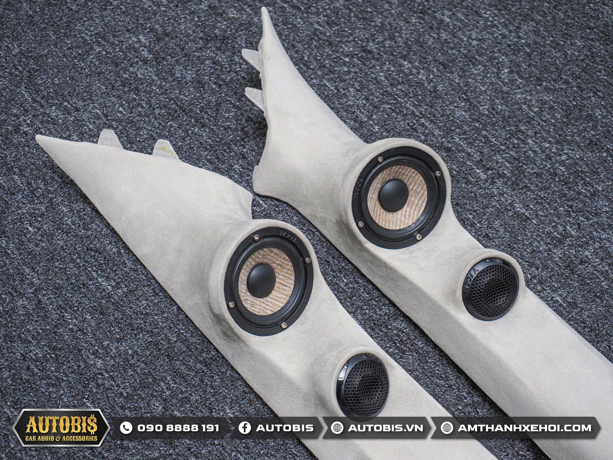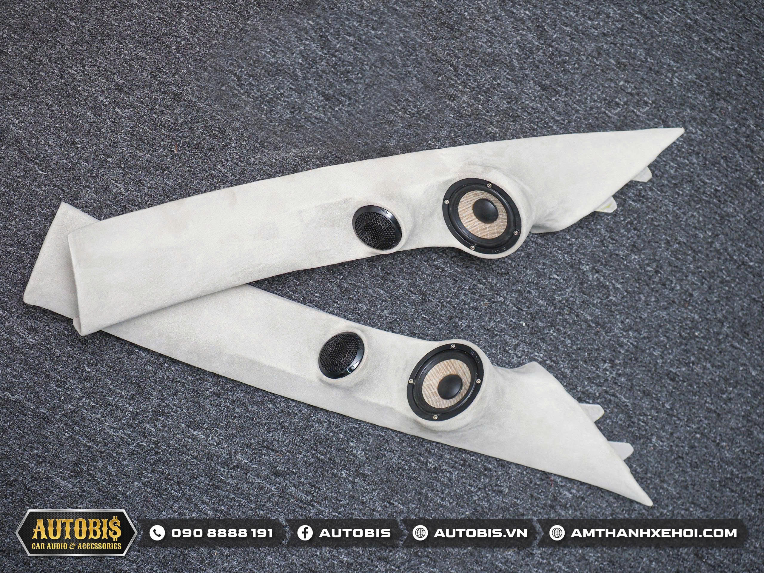 Ở phía trước loa treb và loa mid được thi công lên cột A giúp âm hình chuẩn hơn, sân khấu âm thanh rộng và cao, giọng ca nổi rõ ở trung tâm taplo thay vì bị dồn xuống cánh cửa như hệ thống zin. Thi công cột A được đội ngũ AUTOBIS làm hoàn toàn bằng thủ công cực kì thẩm mỹ và sắc nét.
