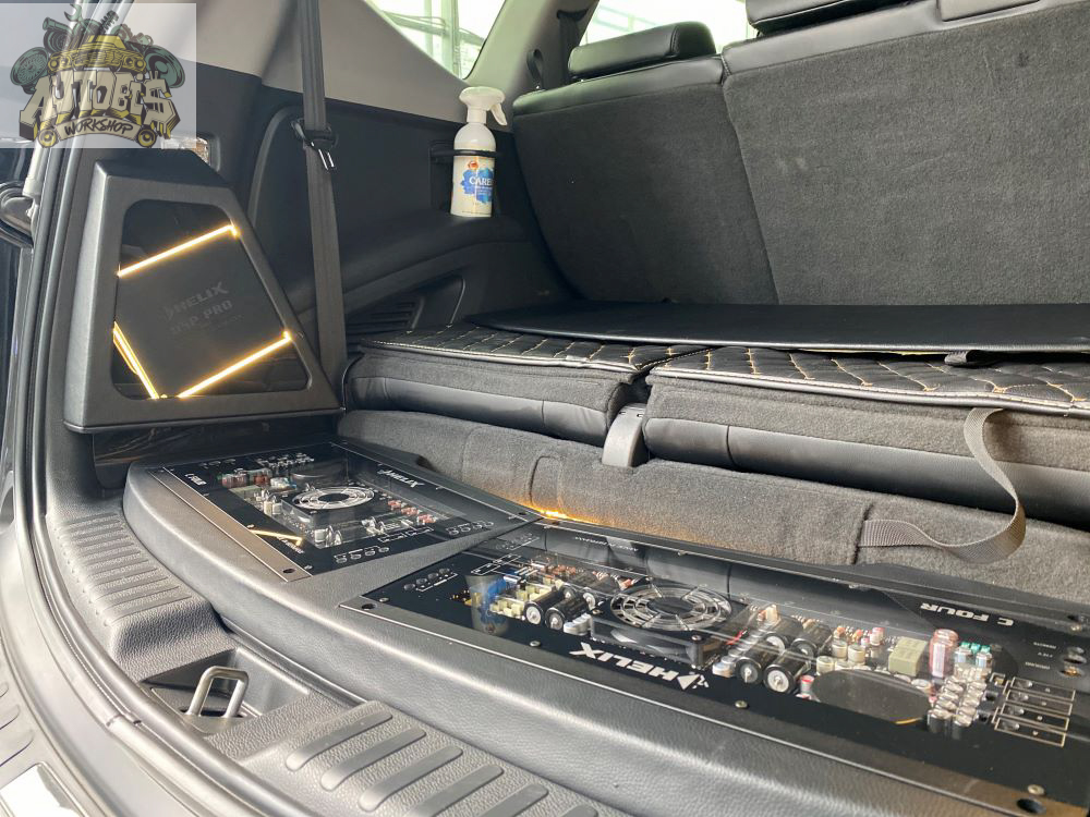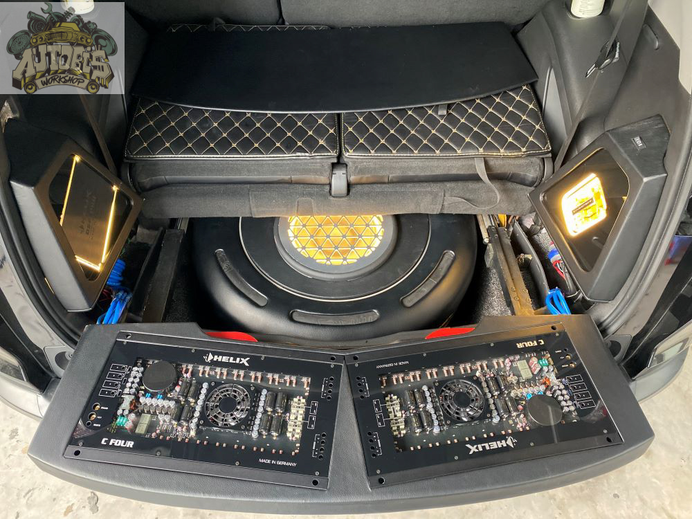 Và hệ thống thiết bị gồm ampli, sub, cầu chì, bộ xử lý tín hiệu được để phía sau.