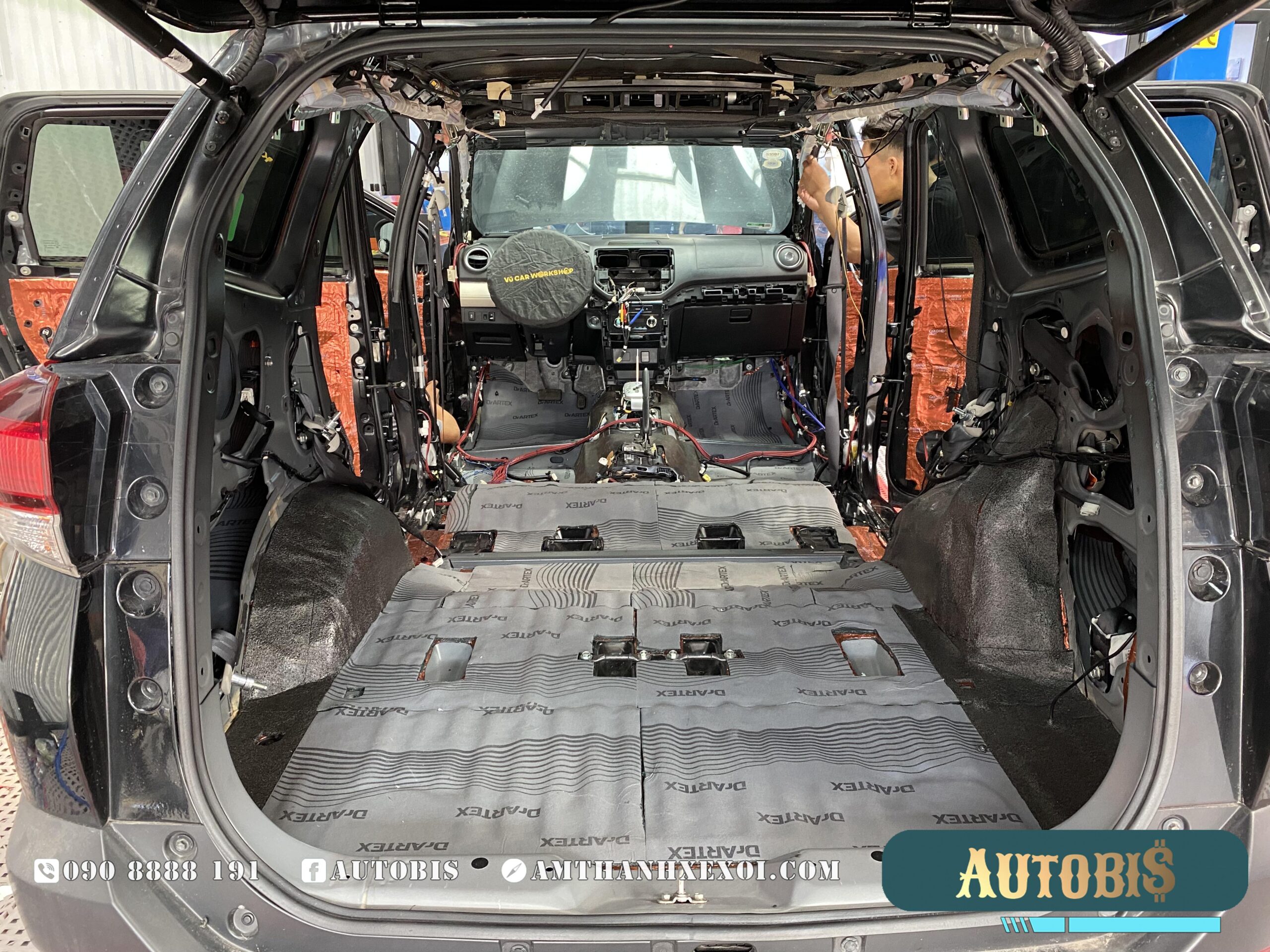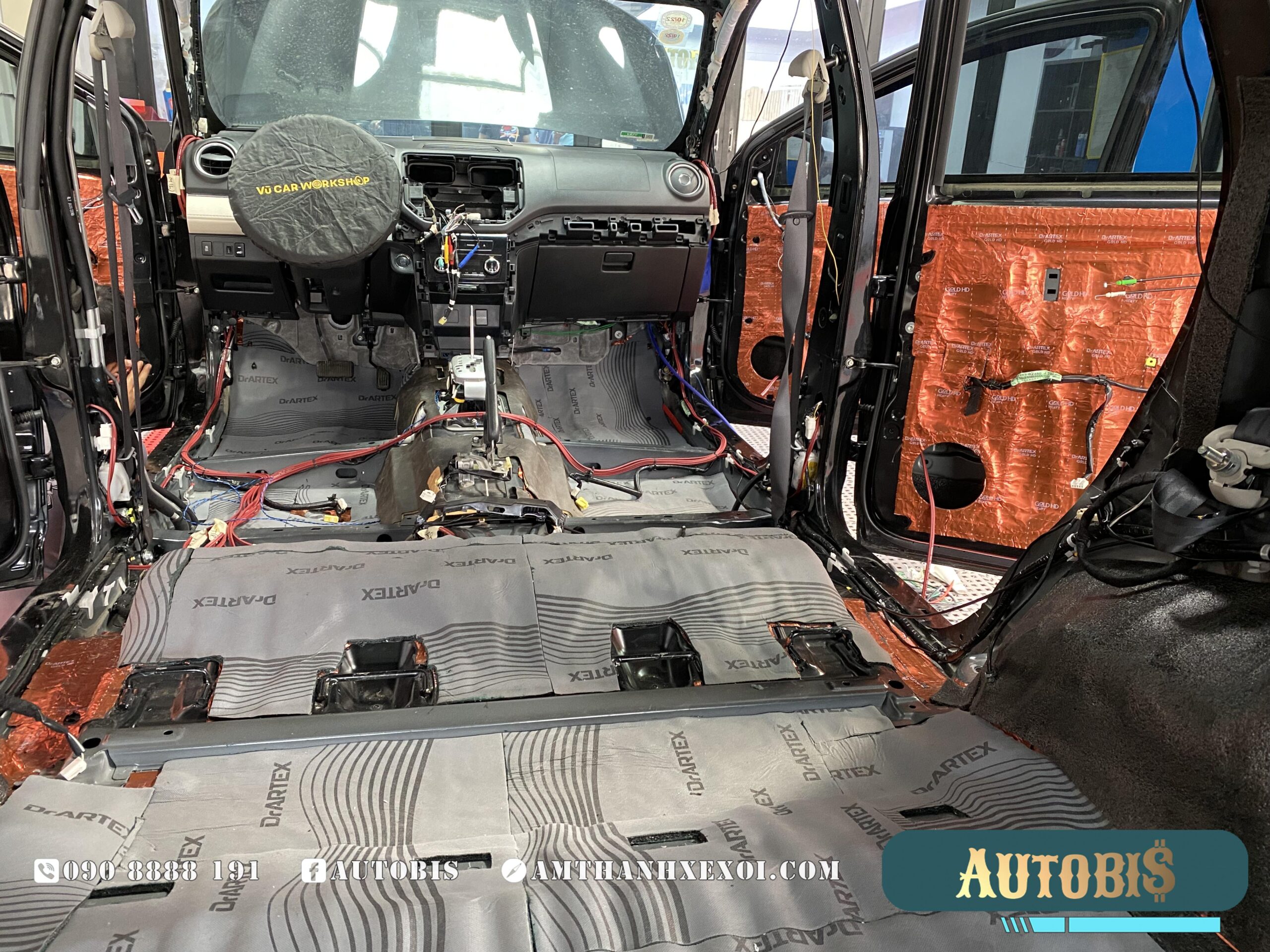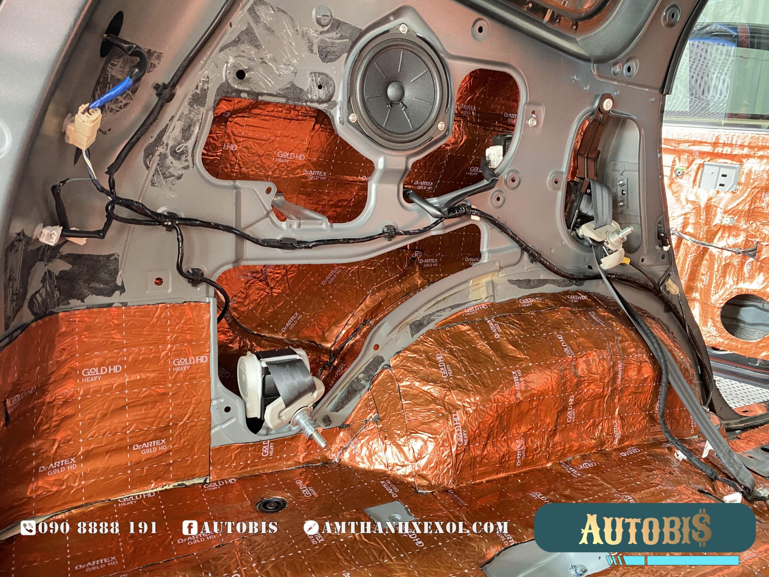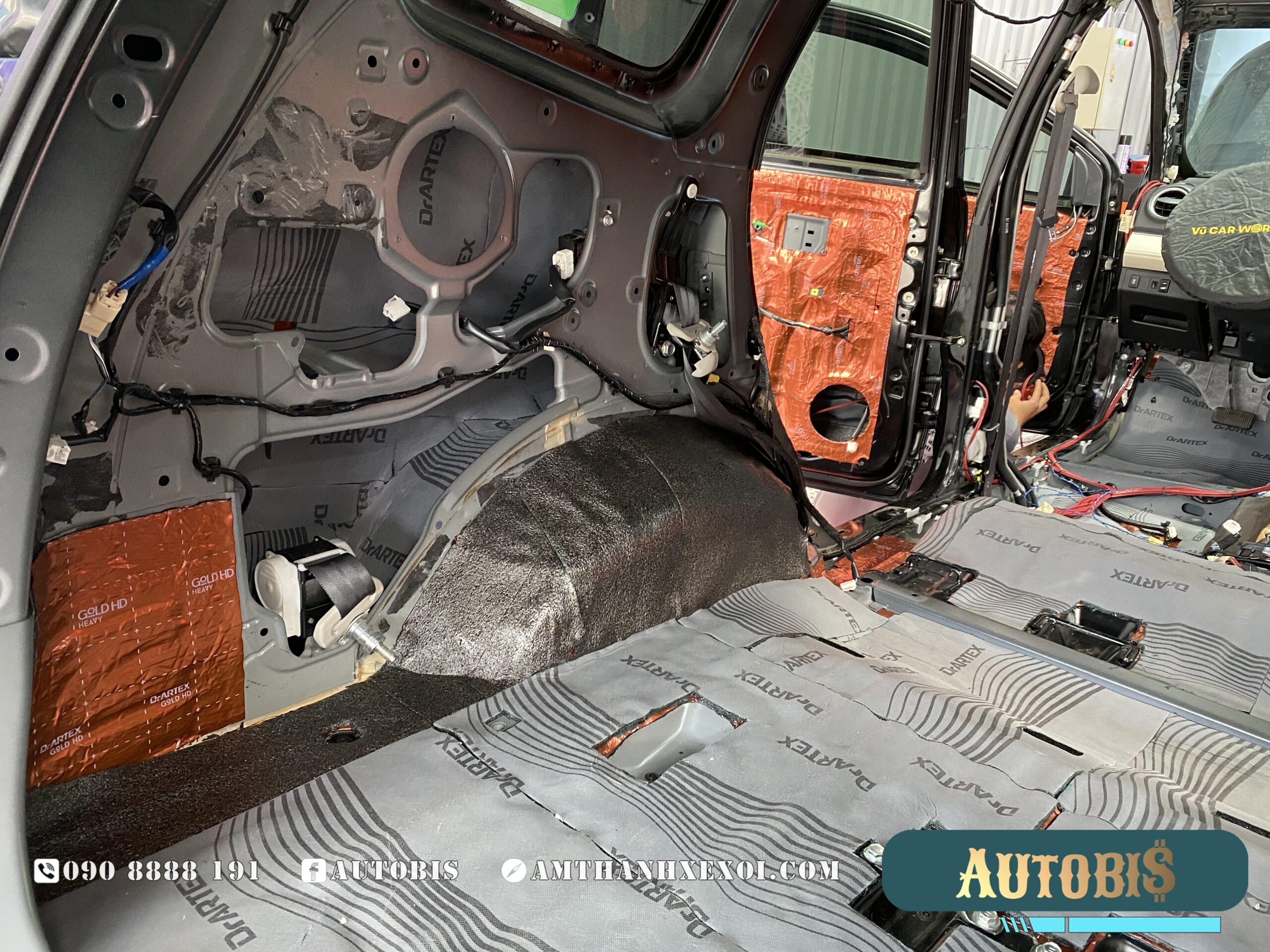 Cách âm sàn: Được thi công với 2 lớp vật liệu, giảm được phần lớn tiếng ồn từ phía dưới vọng lên xe, vị trí này cũng là nới tiêu tốn số lượng vật liệu nhất, khi diện tích rất rộng, và không chỉ dán trên sàn, AUTOBIS còn dán luôn phần trên thân xe, và trên hốc bánh.