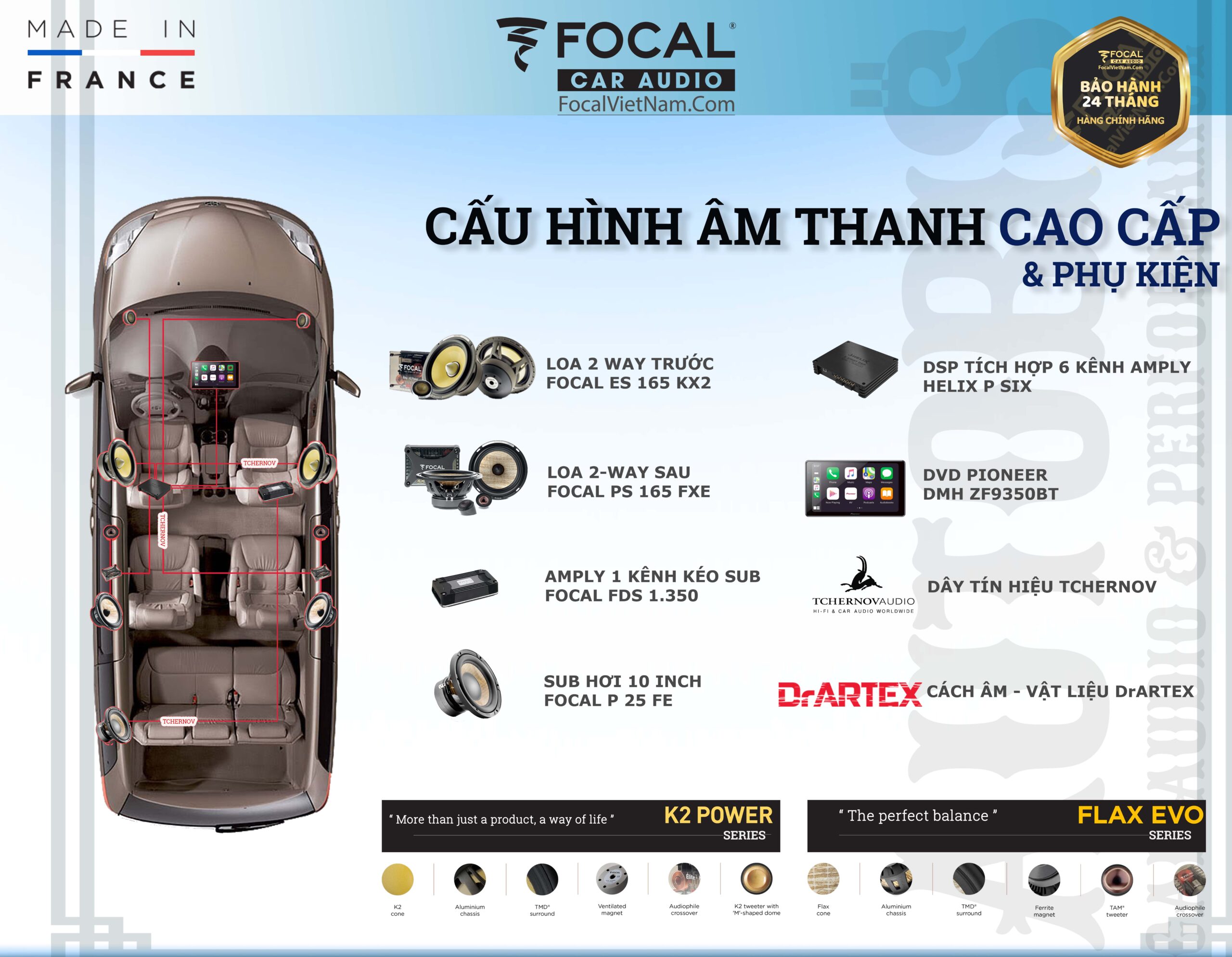 Được coi là sự kết hợp hoàn hảo giữa 2 dòng K2 Power và Flax Evo của thương hiệu Focal. 2 dòng loa được thi công cũng như nhập khẩu chính ngạch từ Pháp, đều sử dụng công nghệ loa trong nhà áp dụng lên chính chiếc xe của mình. Mang đến những trải nghiệm âm thanh tầm cao hơn so với những dòng loa thường của Focal, cũng như những dòng loa khác có ngang tầm giá.